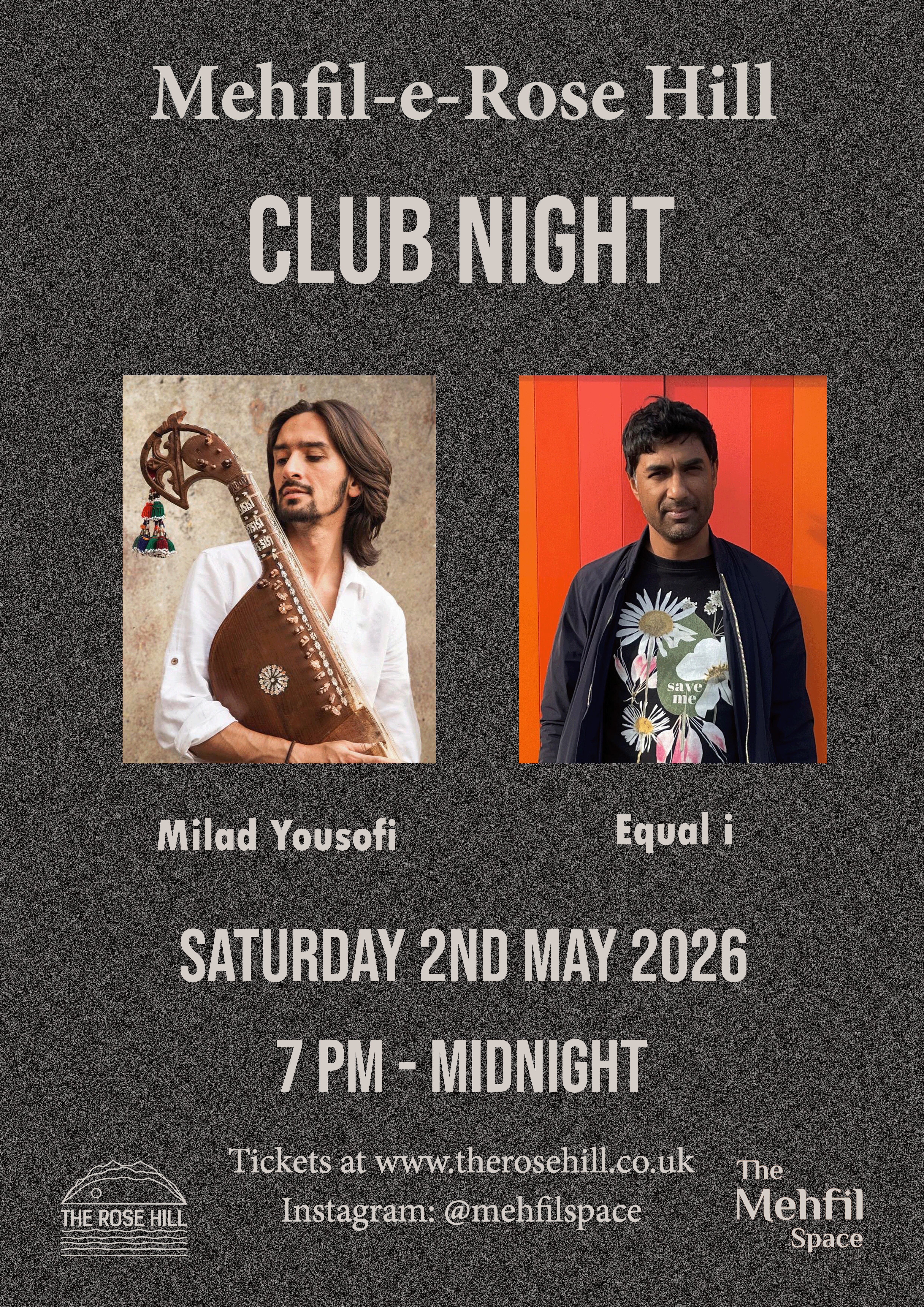 Joining him is musician Milad Yousofi for a special live collaboration on Afghan rubab. First imagined when Milad performed at The Rose Hill last year, this meeting of sounds now comes to life, layering the raw, rhythmic beauty of the rubab over deep, tabla-driven beats, with echoes of Equal-i’s West Indian heritage in dialogue with global club culture.