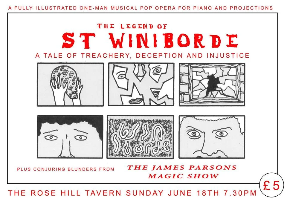 The Legend of St Winiborde is a one-man musical by Iain Paxon for piano, voice and a sequence of over 100 hand drawn projected slides . This lo-tech fictional show charts the rise of Winiborde from disgruntled visionary to Sainthood. Set in Britain in the 1100's (AD), the story draws parallels with the rise of Christianity, the break with the Old Religions, and the subsequent re-assembling of history in their own favour....the evening will also feature James Parsons Magic Show, a wonderment of conjuring blunders.